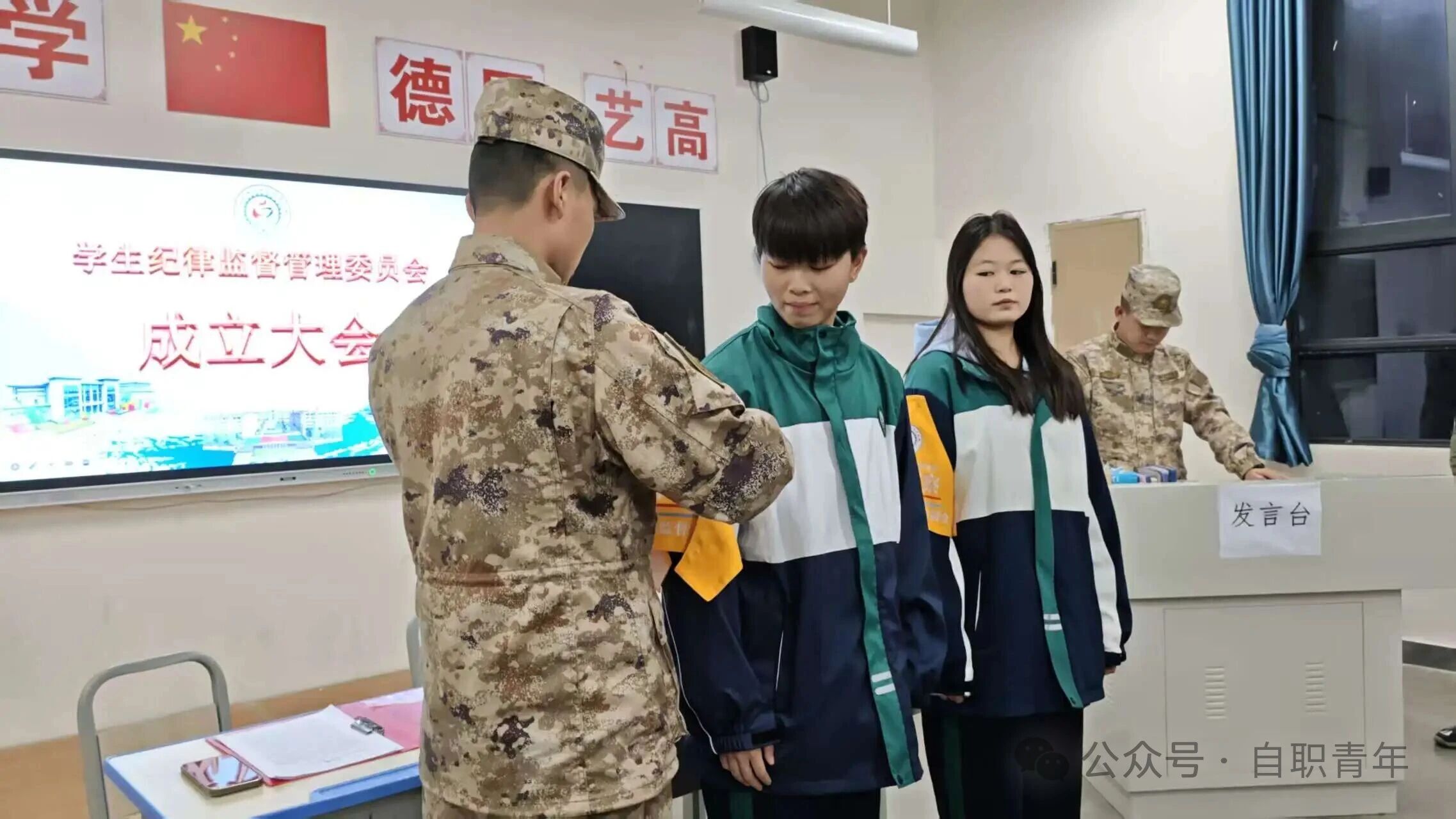 学生处杨树高主任向纪委会主席张榆松同学佩戴袖标,学生处德育教官刘浩文向纪委会副主席应悦茹同学和刘欣语同学佩戴袖标。 袖标是“自我管理、自我服务”的可视化标识,佩戴它意味着扛起维护校园秩序、助力学风建设的责任,时刻提醒持有者以更高标准约束自身言行。它清晰界定了学生纪委会成员的身份,既是师生认可的“秩序守护者”象征,也是方便同学求助、师生沟通的直观标识,让责任身份一目了然。袖标承载着“以纪正行、以律护航”的使命,佩戴者需以客观公正为准则,用行动传递对规则的敬畏、对公平的追求,成为优良校风的践行者与传递者。