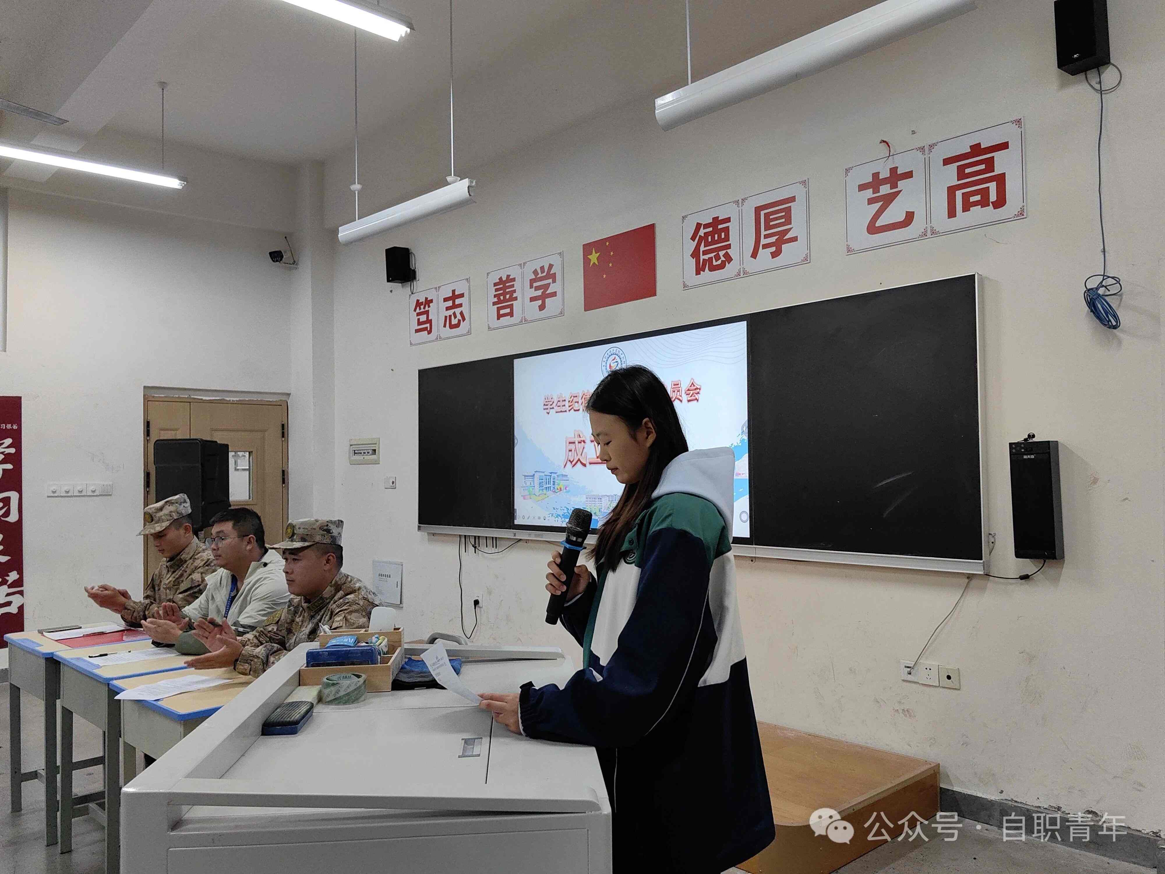 学生处副主任杨树高就学生纪律监督管理委员会成立的意义、行为作风、工作要求和希望要求。杨主任表示,学生纪律监督管理委员会是实现“学生服务学生”、“学生自律监督”、“学生行为表率”的先进集体,做同学的有心人、做师生的纽带。杨主任要求全体委员会成员做到令行禁止强落实、准军事化管理强作风;内涵行为作表率、行为规范亮利剑。最后,杨主任表示,学生纪律监督管理委员会和学生自主管理委员会具有同等地位,纪委会的任务和职责更加艰巨,对纪律、作风的要求更高,同学们要成为校区的一道亮丽的风景线,要成为校区的标杆,对内纪律严明、作风优良,具备高中阶段学生的优良素质,做到在校是一名文明有礼、尊师重教的好学生,在外是一名遵纪守法、尊老孝亲、勤劳活拨的好孩子。讲话最后,杨主任宣布“学生纪律监督管理委员会正式成立!”