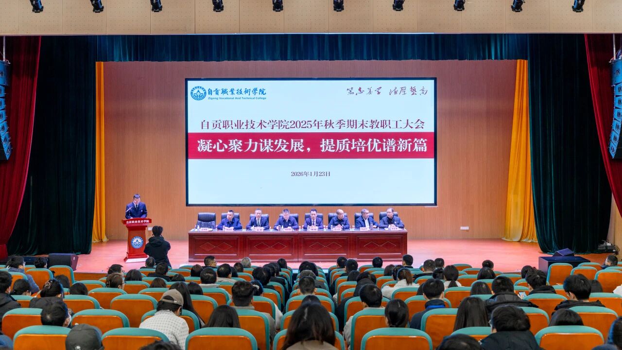 1月23日上午,自贡职业技术学院2025年秋季学期期末教职工大会在学术交流中心3018报告厅召开。党委书记朱成勇、执行校长杨林及全体校领导与教职工齐聚一堂,围绕“凝心聚力谋发展,提质培优谱新篇”主题,系统总结过去一学期工作,统筹部署2026年重点任务。会议由副校长王世强主持。