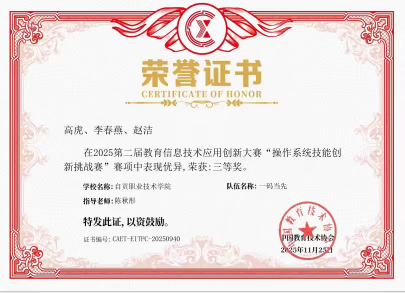 在此高规格赛事中,我校2024级计算机应用技术专业4班学生高虎、赵洁、李春燕,在陈秋彤老师的全程指导下,凭借顽强拼搏的精神与扎实的技术能力,从西南区域赛突围,晋级全国总决赛,最终在“应用软件适配迁移赛”与“操作系统技能创新挑战赛”两项赛道上,双双斩获全国三等奖。