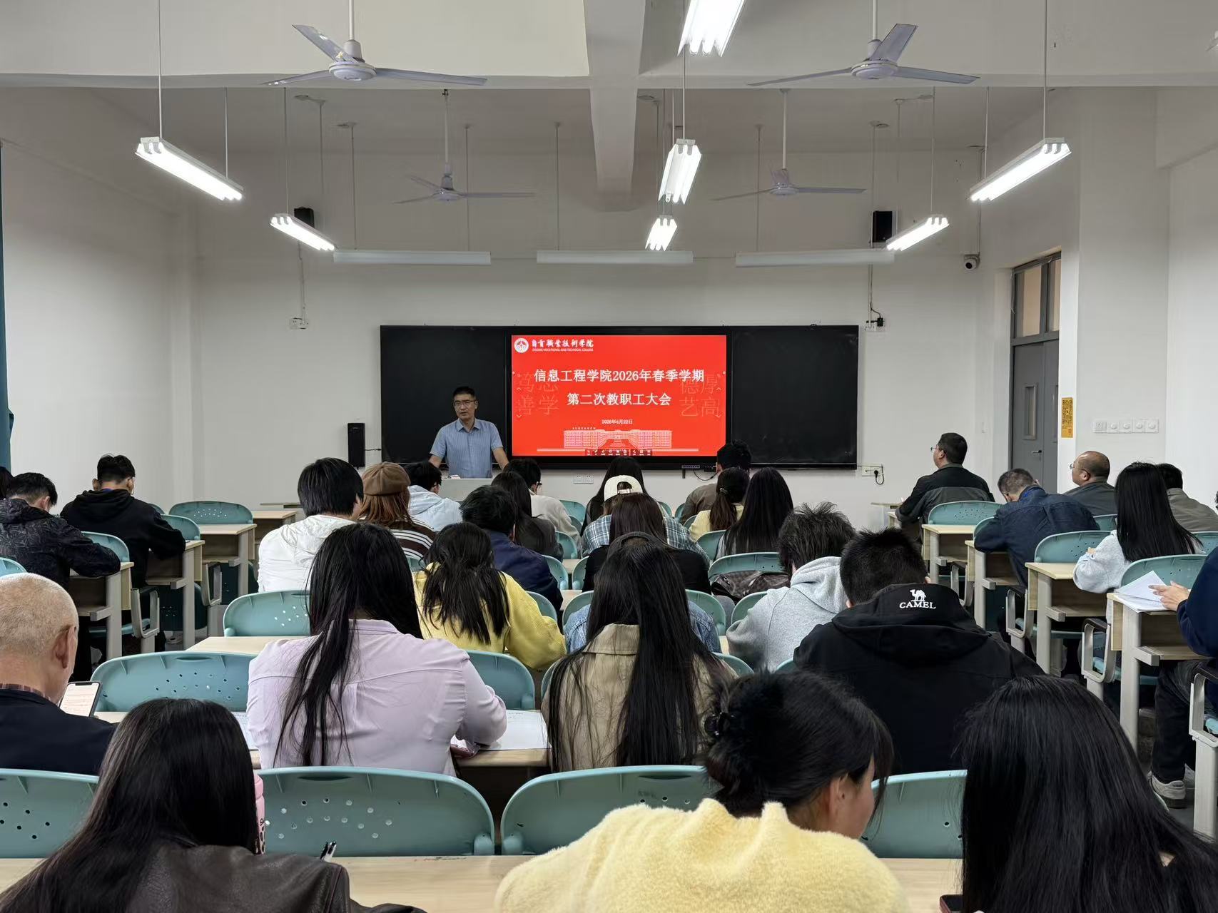 为进一步明确学院发展目标,统筹推进各项重点工作落地见效,2026年4月22日,信息工程学院在4411教室召开2026年春季学期第二次教职工大会。信息工程学院院长罗胜木及信息工程学院全体教职工参加,大会由罗胜木主持。