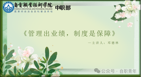 随后,学校办公室邓德林主任以《管理出业绩,制度是保障》为题进行分享。邓主任从学校日常管理的各个环节入手,讲解了完善管理制度、优化管理流程对提升教学质量和办学效益的重要性,强调要通过科学管理激发教师工作积极性,保障学校各项工作有序推进。