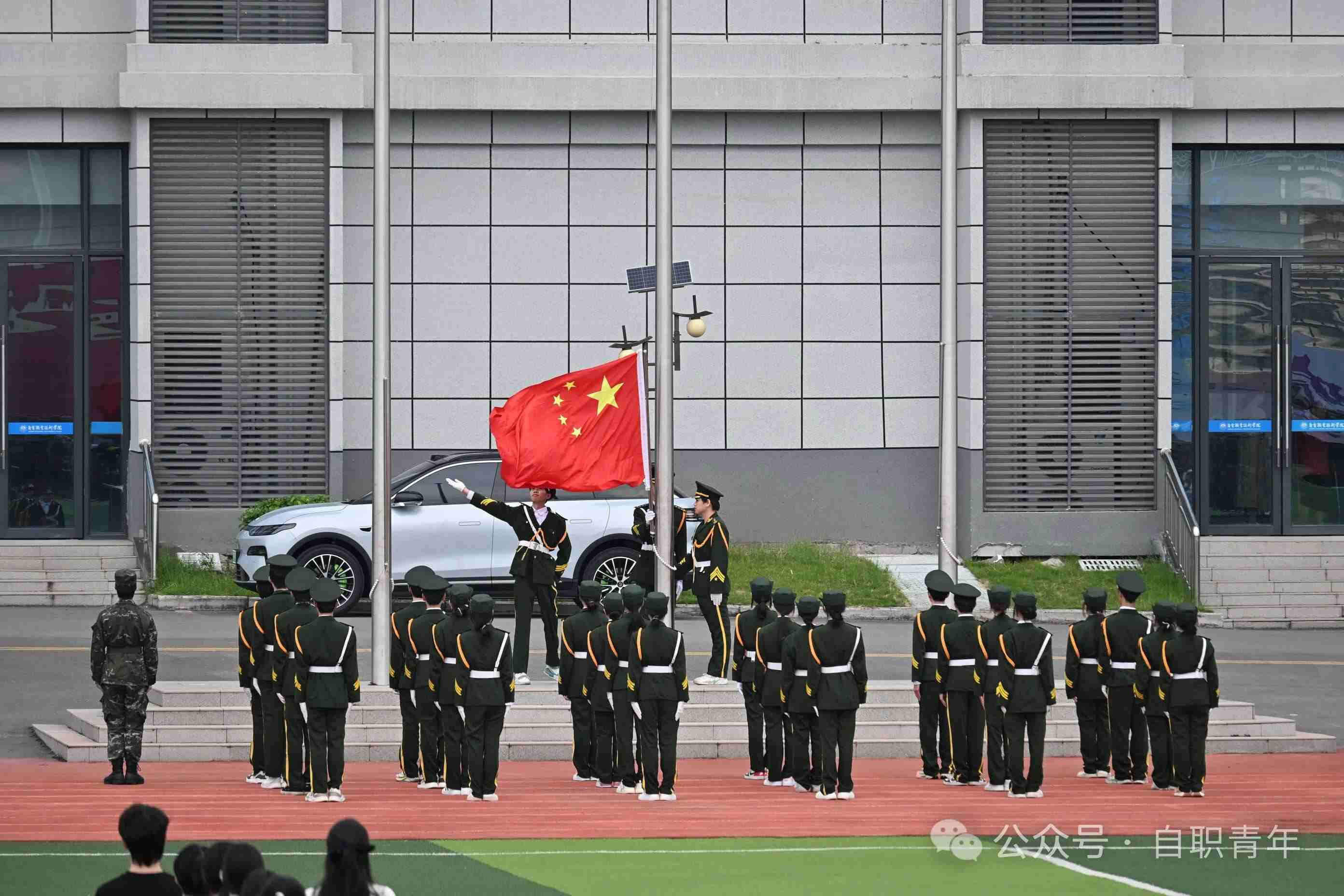国旗在庄严的国歌声中冉冉升起,全体师生庄严肃穆。