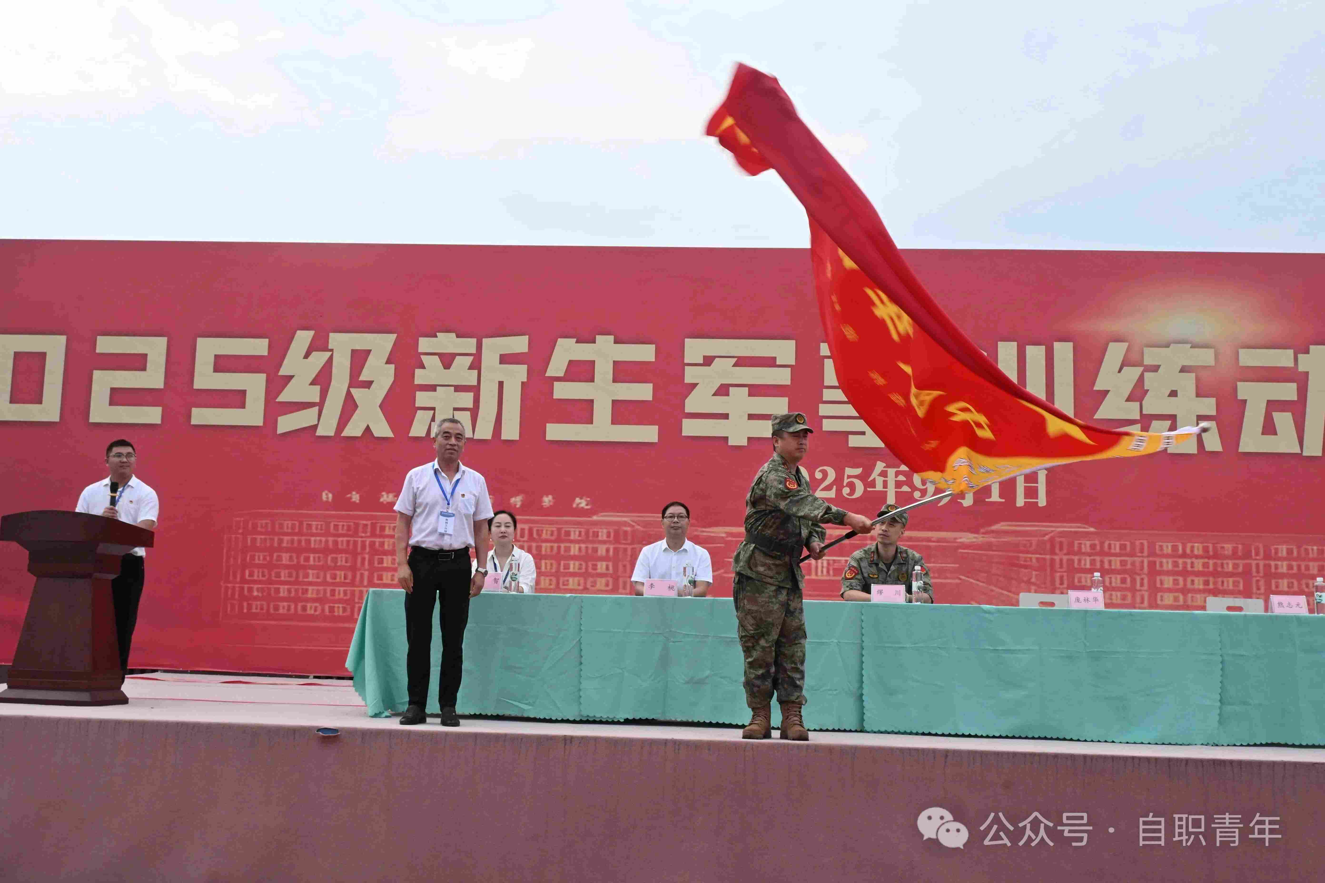 庞林华校长将象征荣誉与责任的队旗授予军训大队刘正凯教官。这面旗帜不仅代表信任与使命,更将激励同学们勇毅前行,圆满完成军训,真正融入自职院中职部这个大家庭。