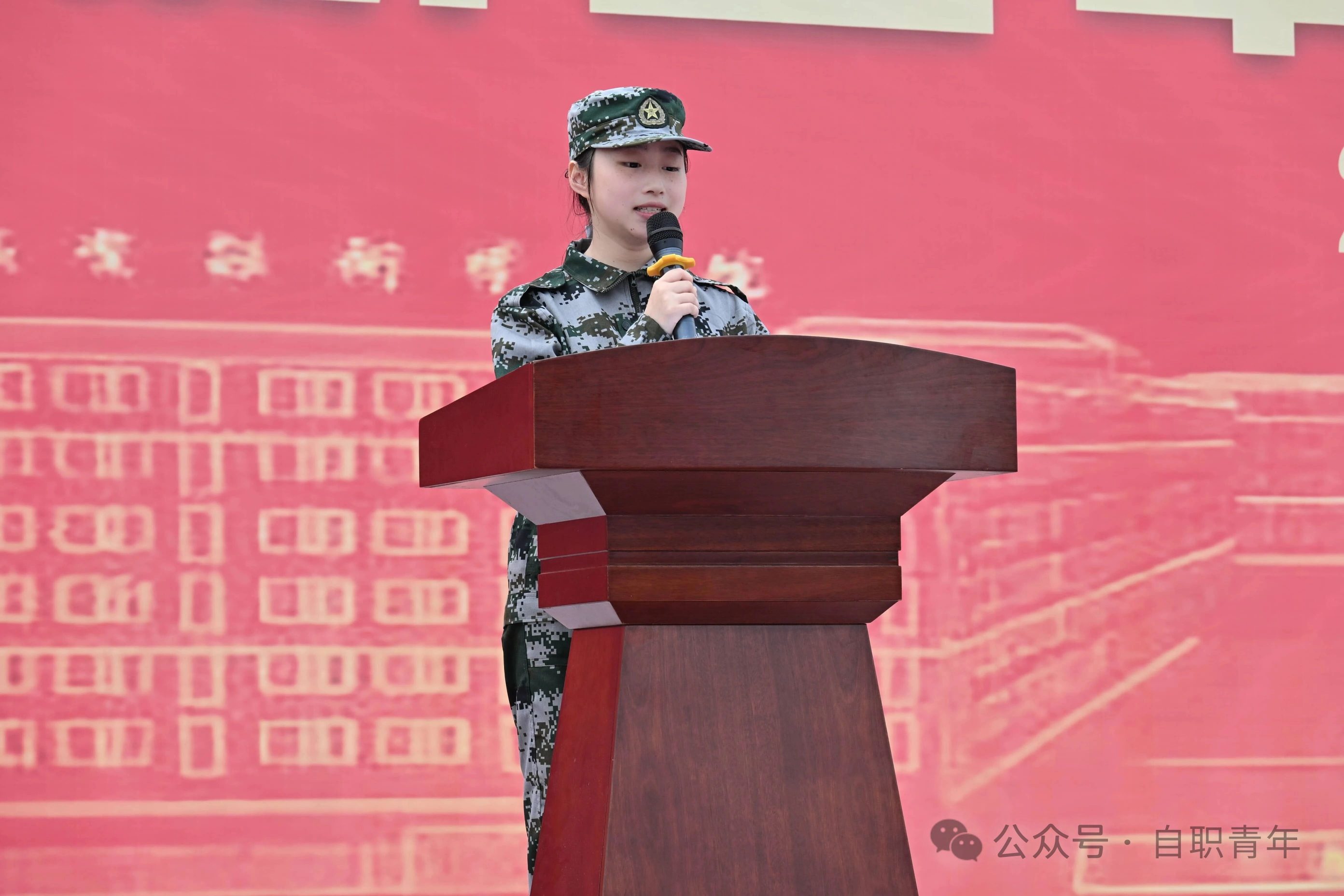 2025级2班新生代表杨付莲作为新生代表发言,他首先代表全体参训同学,向为军训筹备的领导、教官及陪伴的老师致以崇高敬意与衷心感谢,感谢大家搭建起让同学们体验军营生活、突破舒适区的成长平台;接着引用 “天将降大任于斯人也,必先苦其心志,劳其筋骨”,并以幼苗经风雨扎根、雏鹰搏击长空作喻,阐释军训是为成长 “赋能” 的修行,能帮助大家摆脱娇气,培养团结、坚持、自律等未来应对挑战所需的关键品质;随后代表全体同学郑重承诺,将以军人标准严格要求自己、认真学习训练技能与军人作风、团结互助共成长、严守纪律展风貌。