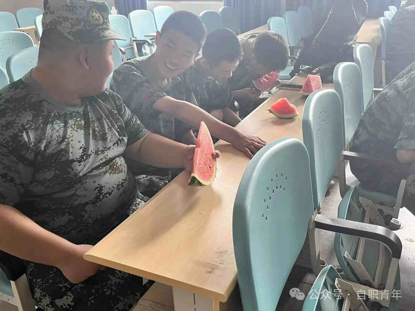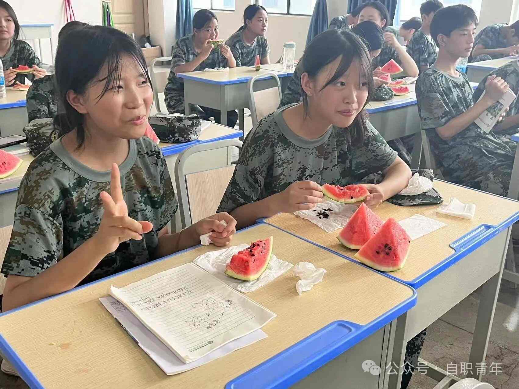 观影结束后,班主任送来了夏日解暑神器——西瓜,同学们在吃瓜的同时露出了灿烂的笑容。