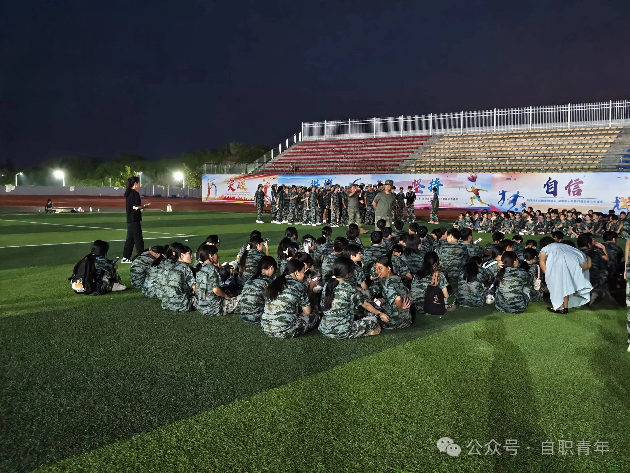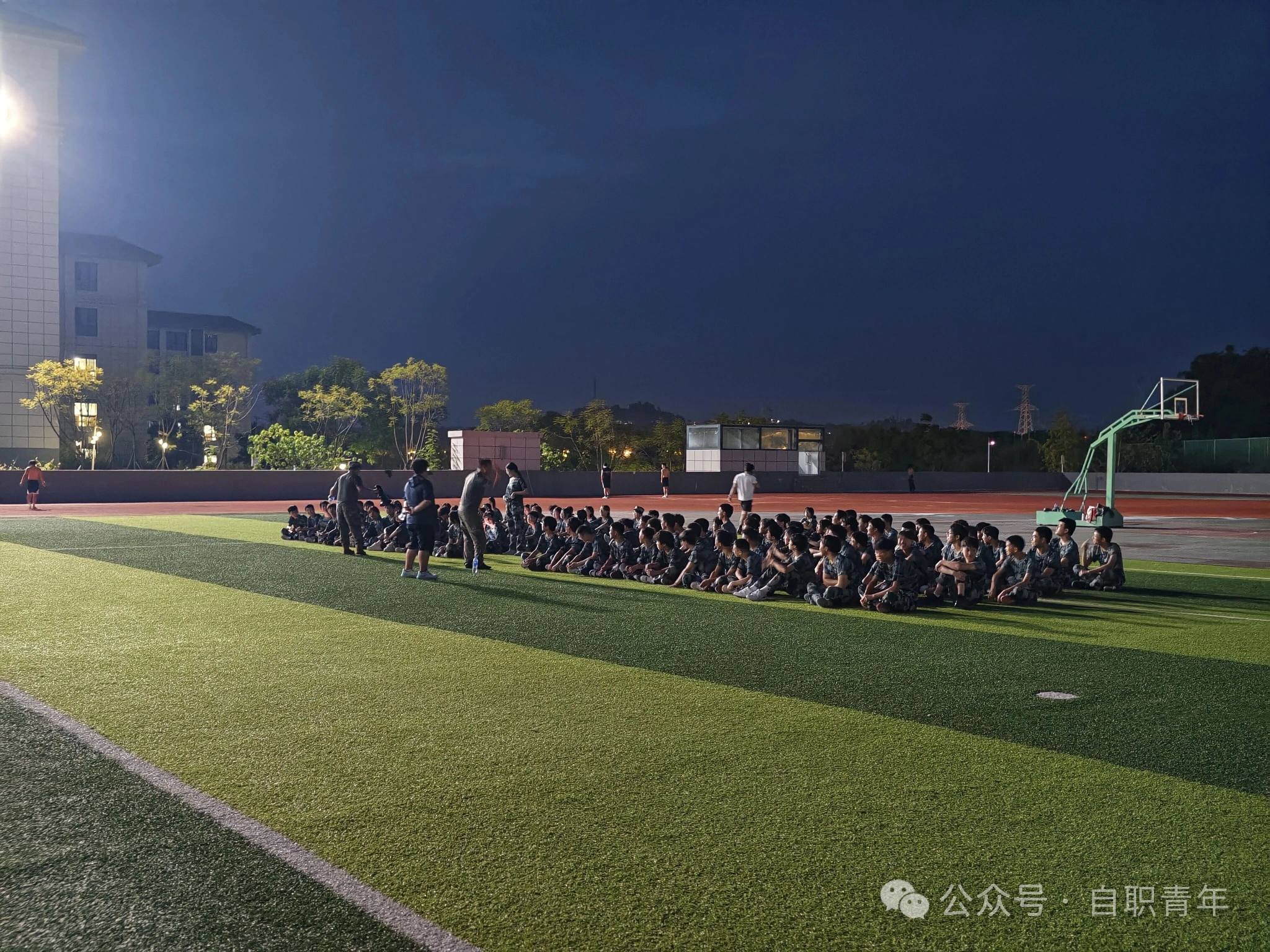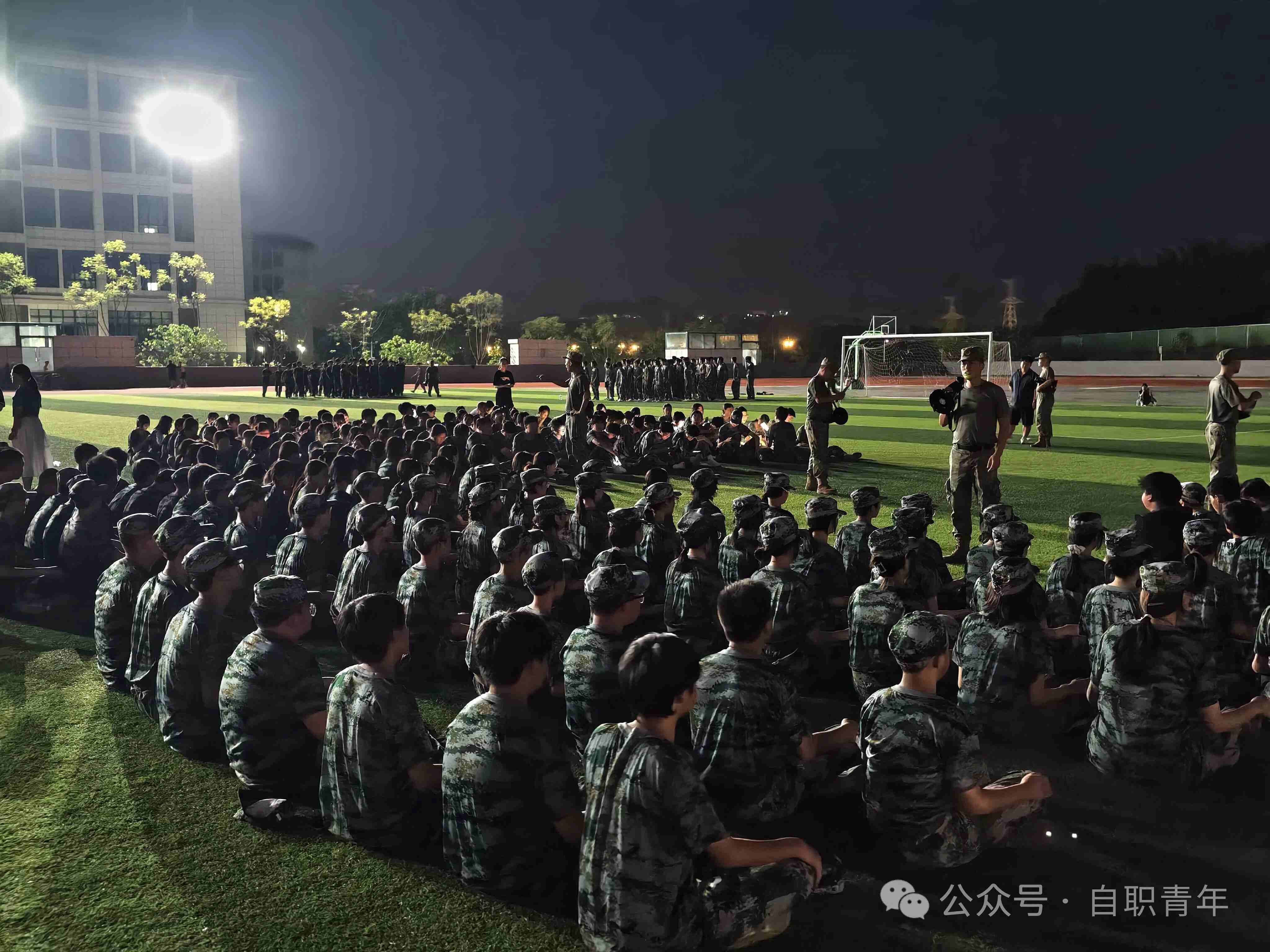晚上由教官组织和班主任任的陪同下在学校运动场开展军歌学习,通过学习同学们已经掌握唱军歌的基本要领,唱军歌是为了感受当代革命军人能打胜仗、作风优良的良好品质,作为当代中学生应该时刻关心国防,长大后投身国防。