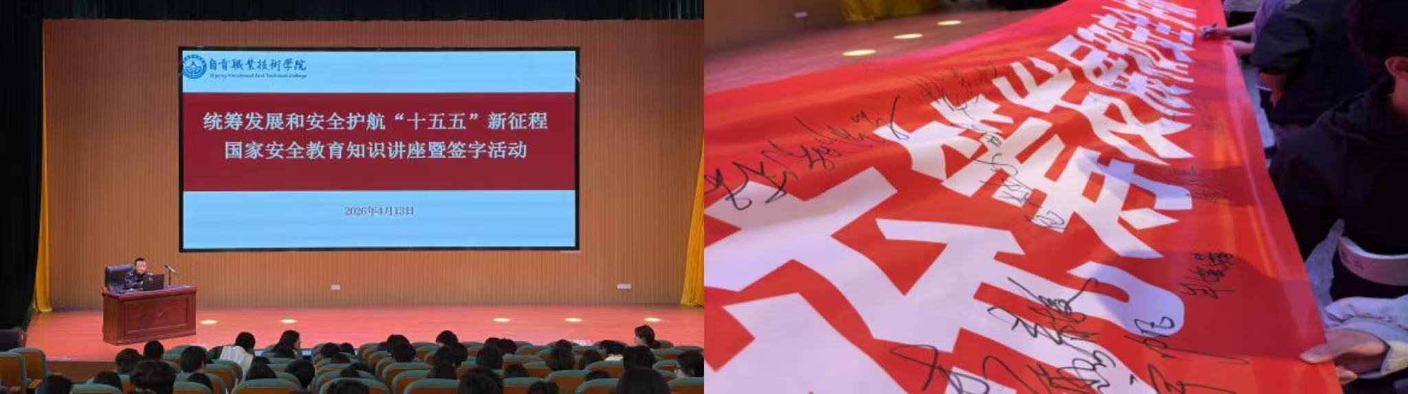 4月13日,学校联合大安分局举办国家安全知识专题讲座。受邀警官结合真实案例,为师生普及法律法规与防范知识,剖析危害国家安全行为的表现及法律后果。现场互动积极,掌声不断。讲座结束后,全体师生在“维护国家安全 人人有责”的红色横幅上郑重签名,一笔一划写下名字,许下守护国家安全的庄严承诺。