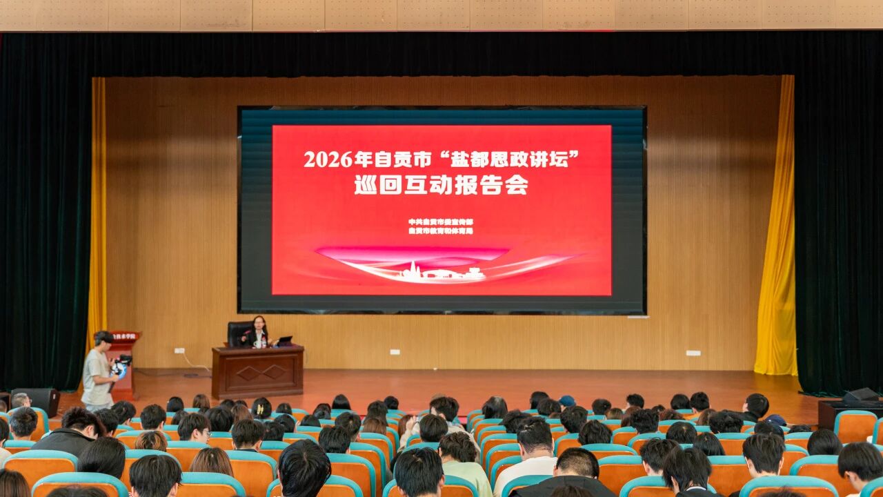 为深入推进“大思政课”建设,弘扬劳模精神、劳动精神、工匠精神,引导我校学生坚定技能报国志向,2026年4月22日,自贡市“盐都思政讲坛”巡回报告会在我校成功举办。中共二十大代表、全国五一劳动奖章获得者、四川轻化工大学教授符宇航应邀作专题宣讲。学校党委书记朱成勇主持报告会,400余名师生代表现场聆听。